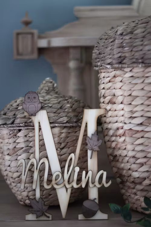 Bokstavstavla med namn (uggla +löv)