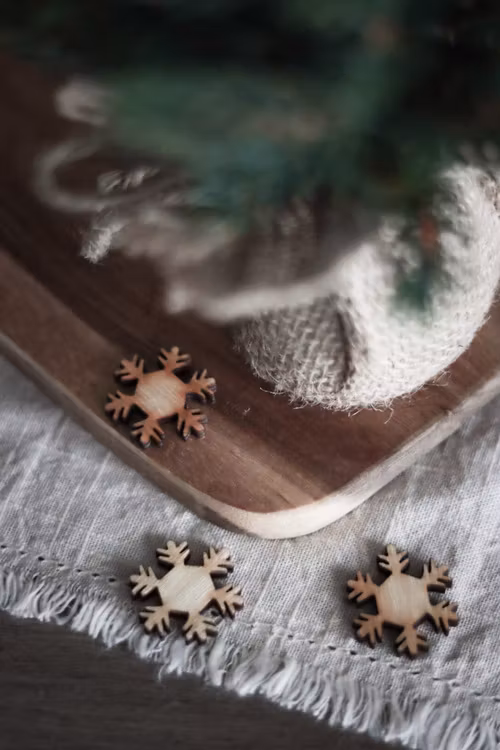 Konfetti i form av snöflingor i trä, fin att dekorera bordsdukningen / juldukningen med.