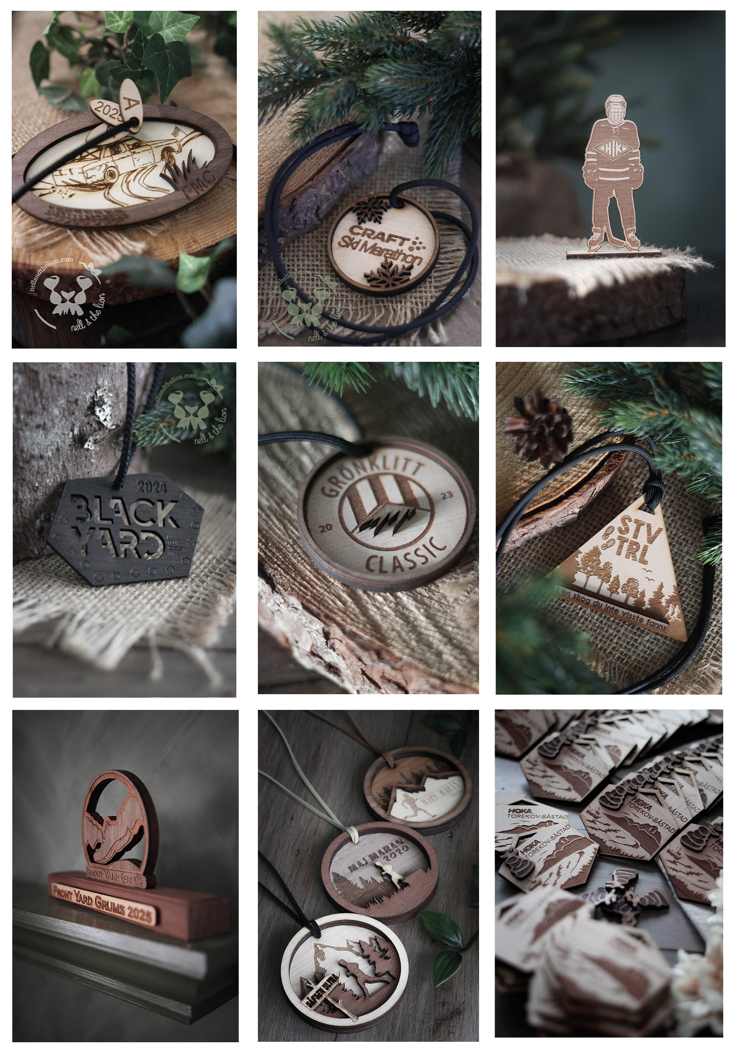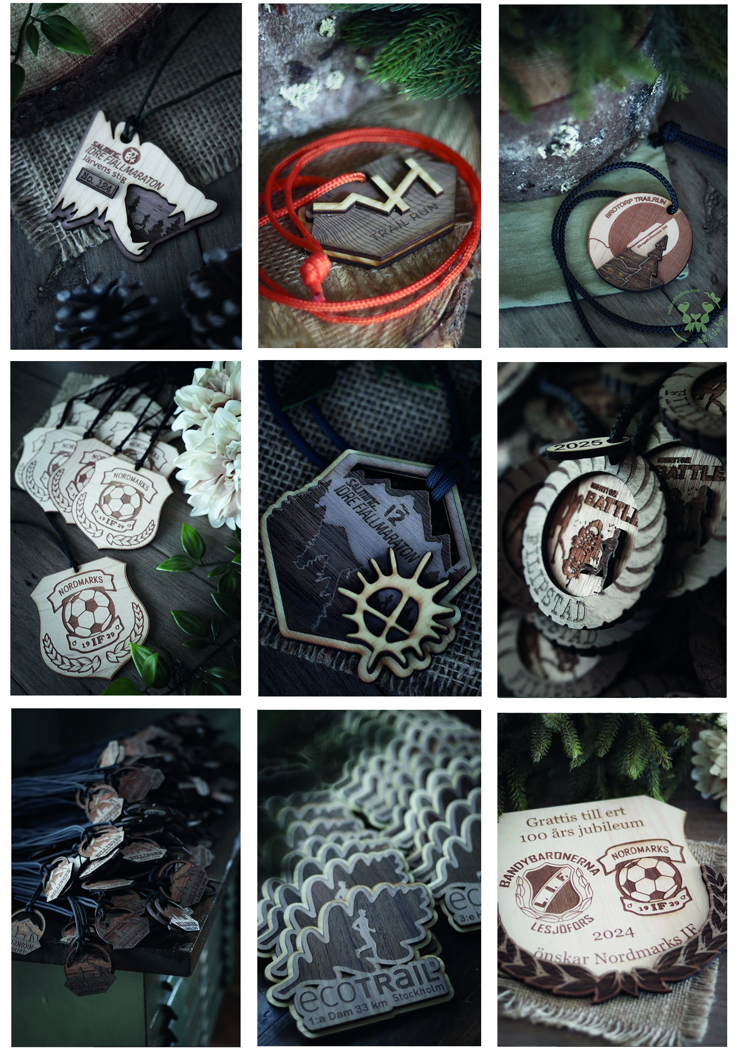 Vi skapar skräddarsydda medaljer/priser/statyetter i olika träslag och akryl. Företag, skolor, föreningar och privatpersoner är alla hjärtligt välkomna att komma med en förfrågan. Vi kommer tillsammans med kunden fram till en design som funkar för oss båda, för oss är det viktigt att båda parter är nöjda. Vi gör allt ifrån ett pris till flera tusen, antalet spelar ingen roll. Vi är stolta över att har flera trogna samarbetspartners som återkommer år efter år för nya medaljer och priser till deras evenemang.